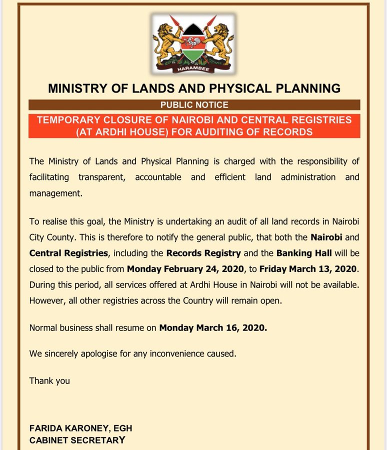 The Ministry of Lands is undertaking an audit of all land records in Nairobi City County. The Ministry, via the official Twitter account, issued a notice to notify the general public that both the Nairobi and Central Registries, including the Records Registry and Banking Hall will be closed to the public from Monday, February 24, 2020 to Friday, March 13, 2020. During this period all services offered at Ardhi House in Nairobi will not be available. However all other registries across the Country will remain open.